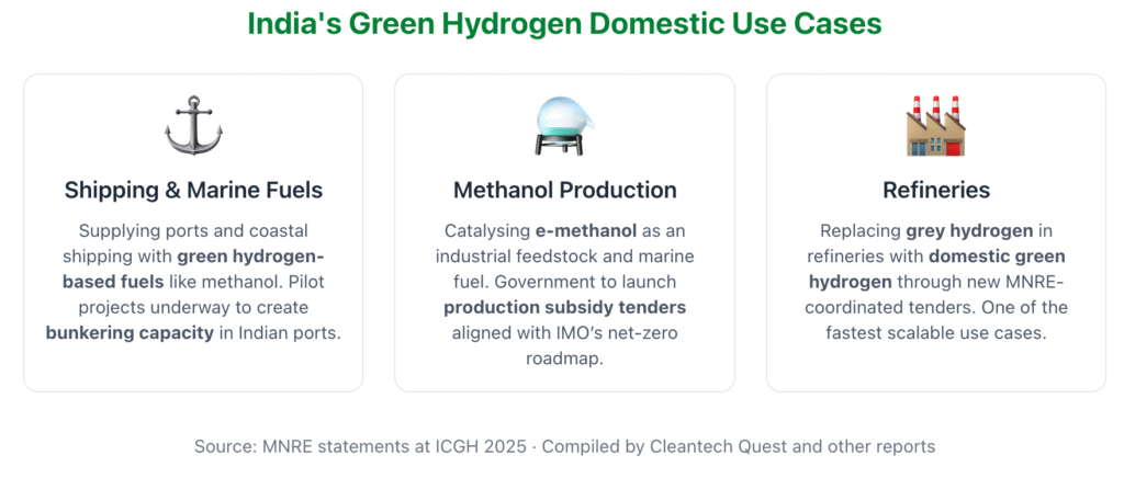 This is a notable shift. Earlier messaging from the National Green Hydrogen Mission leaned heavily on India as an export hub — low-cost renewables at home producing green hydrogen, green ammonia, and green methanol for other countries. Now MNRE is openly prioritising self-consumption in hard-to-abate domestic sectors like refining, chemicals, shipping fuel, and eventually steel.