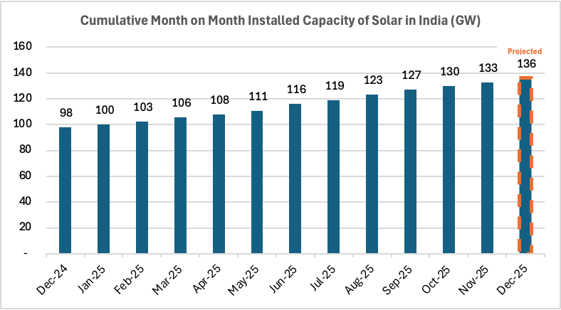 India’s cumulative installed solar capacity grew sharply through 2025, rising from 98 GW in December 2024 to 133 GW by November 2025. This translates into ~35 GW of net solar additions in just 11 months, marking one of the strongest annual expansion phases in the sector’s history.